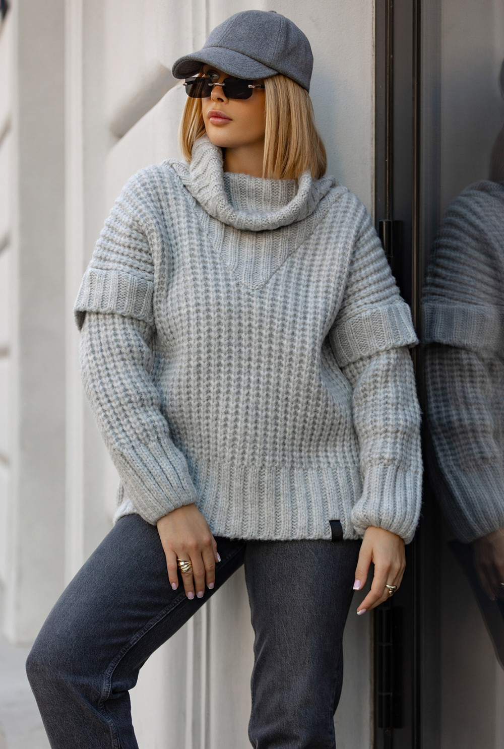Stylowy sweter o luźnym kroju wykonany z miękkiej, przyjemnej w dotyku przędzy. Model wyróżnia się ozdobnym splotem oraz wysokim golfem, który zapewnia ciepło i komfort w chłodniejsze dni. Subtelne falbanki na rękawach dodają mu kobiecego uroku i delikatności. Rękawy wykończone są ściągaczami. Doskonały wybór do codziennych stylizacji.