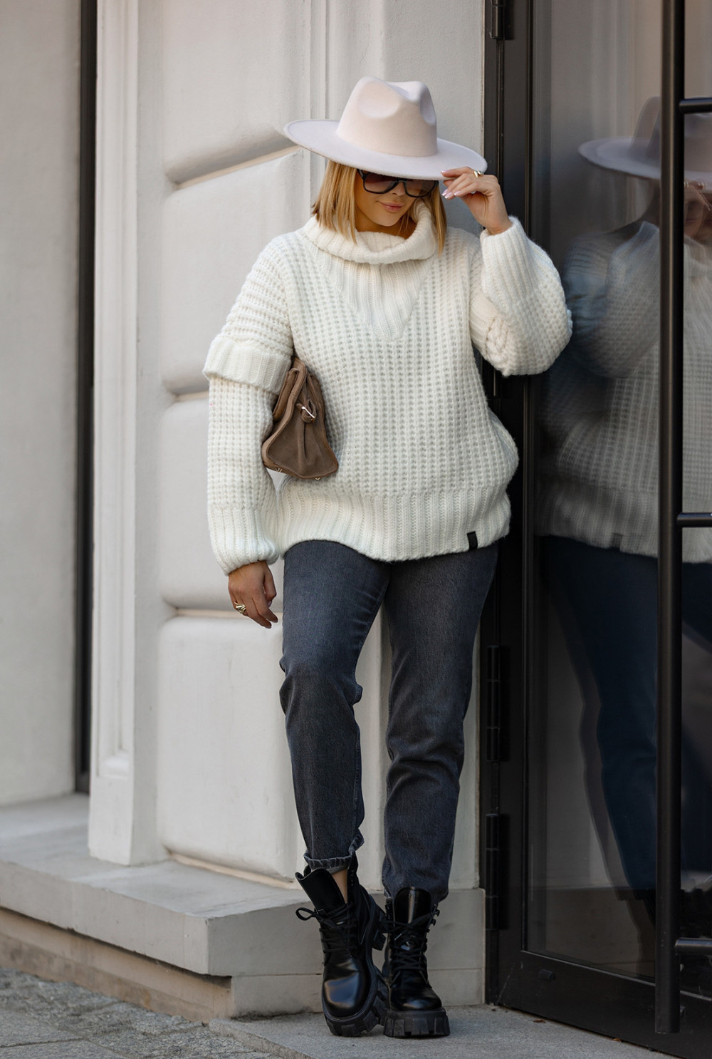 Stylowy sweter o luźnym kroju wykonany z miękkiej, przyjemnej w dotyku przędzy. Model wyróżnia się ozdobnym splotem oraz wysokim golfem, który zapewnia ciepło i komfort w chłodniejsze dni. Subtelne falbanki na rękawach dodają mu kobiecego uroku i delikatności. Rękawy wykończone są ściągaczami. Doskonały wybór do codziennych stylizacji.