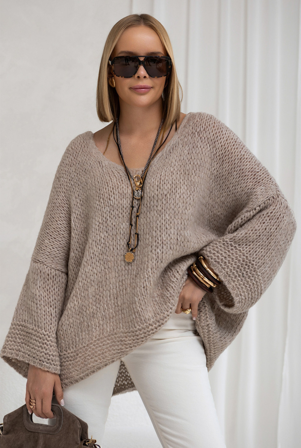 Miękki sweter o luźnym, oversizeowym kroju to doskonały wybór na chłodniejsze dni! Ten ponadczasowy model świetnie sprawdzi się w codziennych, wygodnych stylizacjach. Ma dekolt w serek i lekko skrócone rękawy.