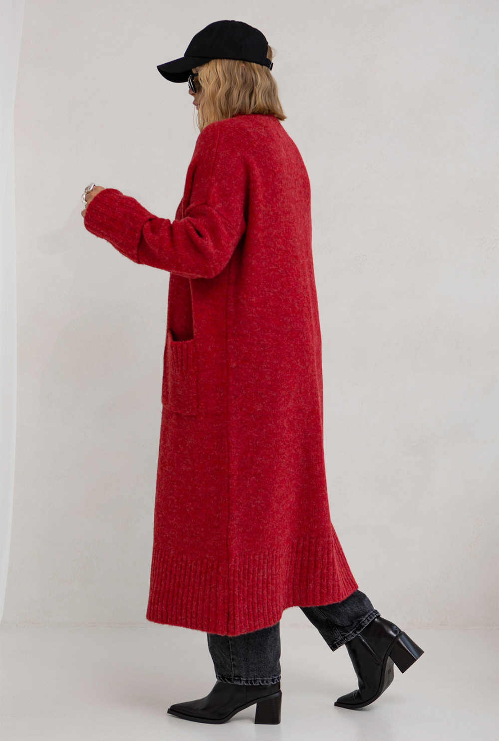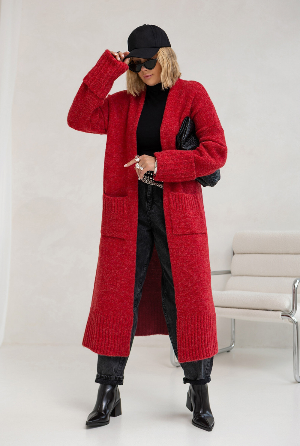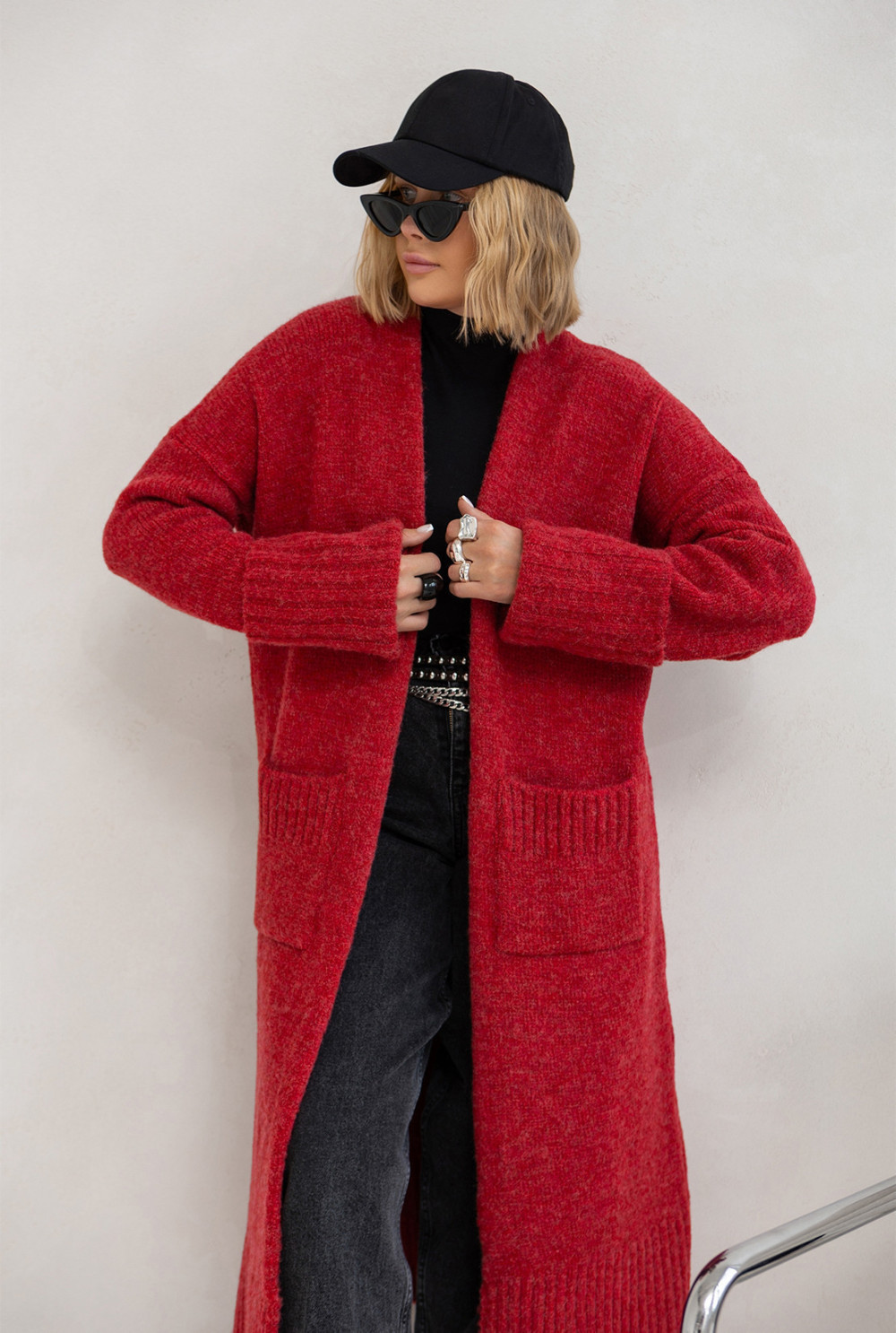 Długi kardigan o luźnym, oversizowym kroju to absolutny must have w kobiecej garderobie! Zwraca uwagę subtelnym splotem, praktycznymi kieszeniami i wywijanymi rękawami. To idealna propozycja do codziennych, komfortowych stylizacji, które łączą styl z wygodą.