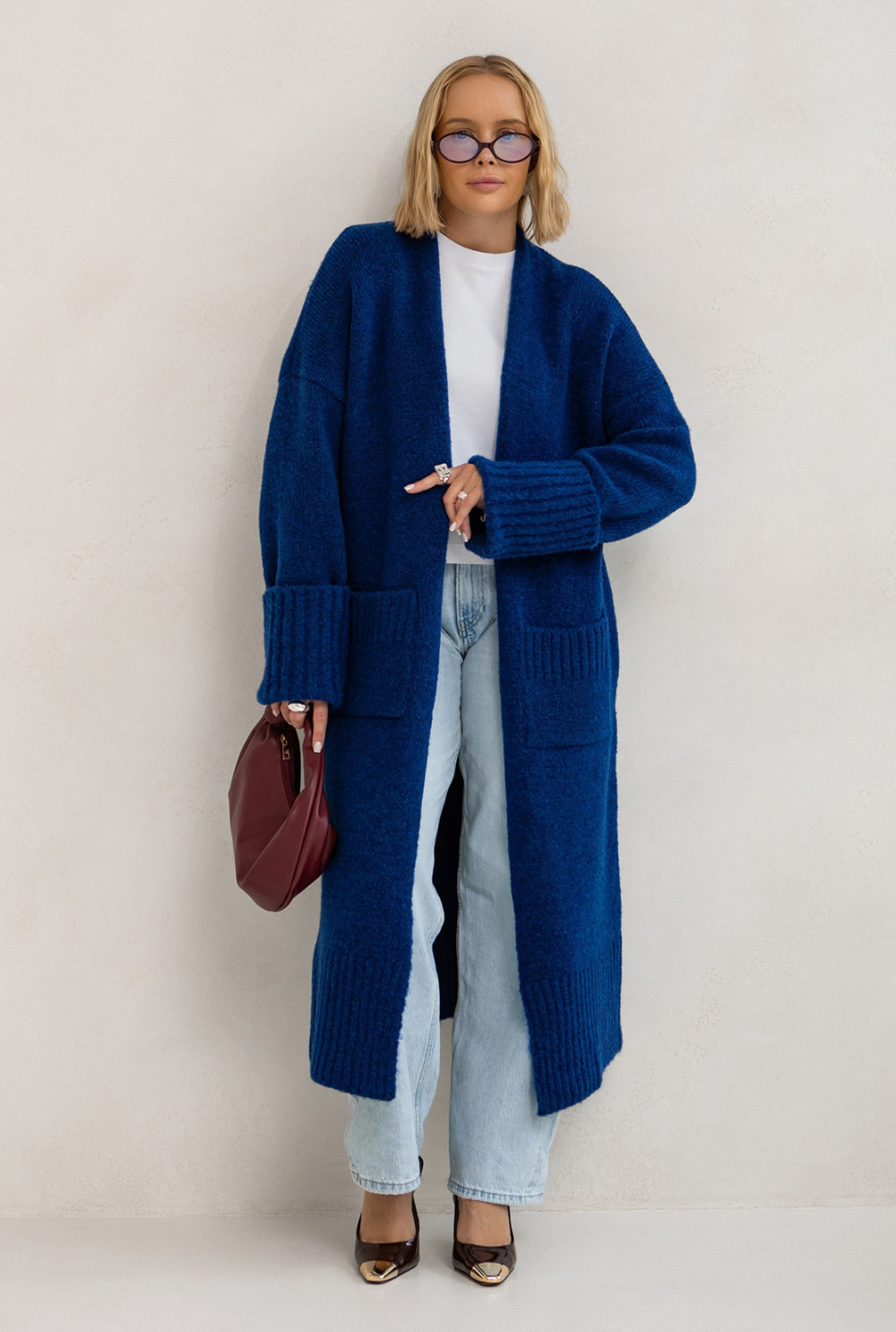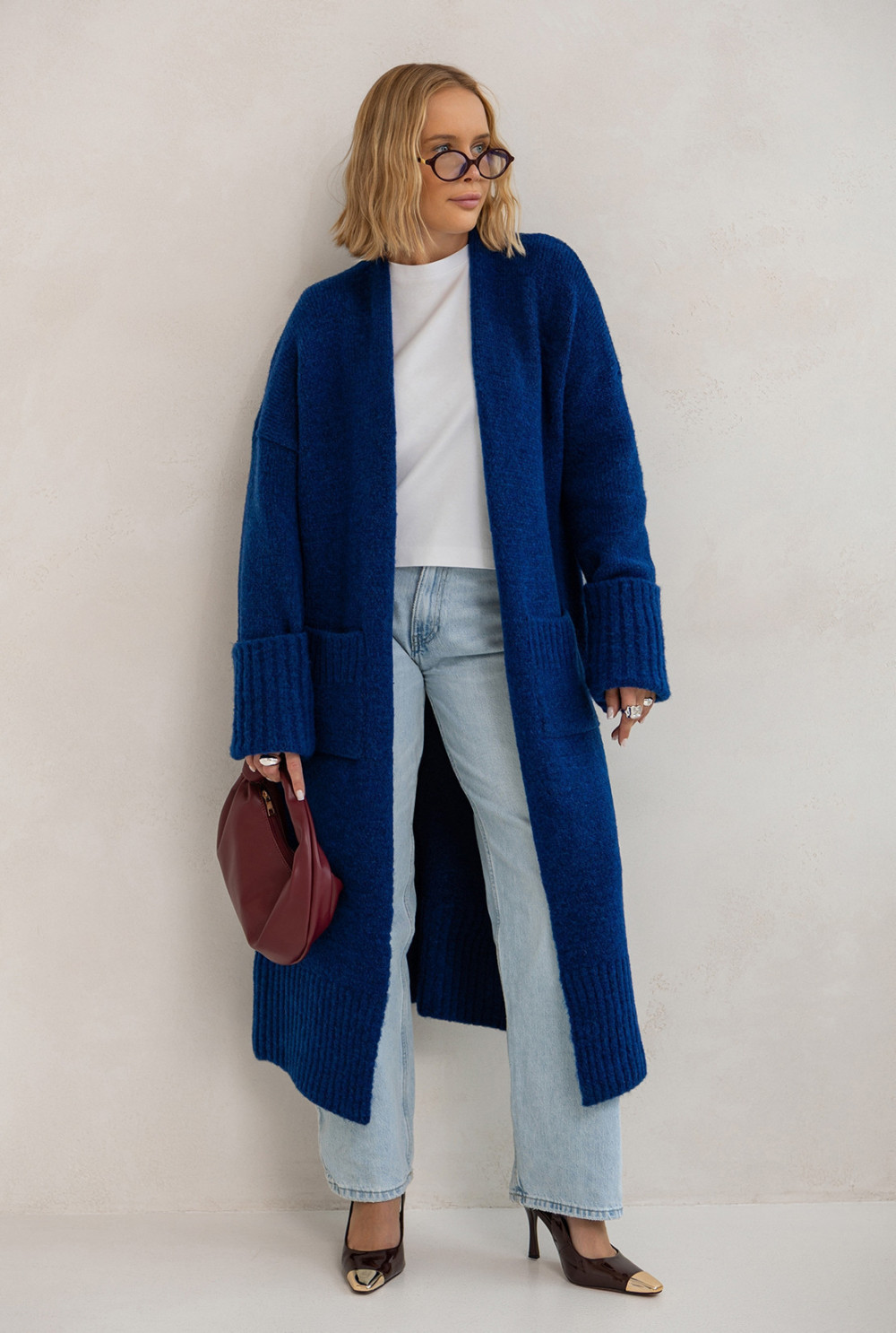 Długi kardigan o luźnym, oversizowym kroju to absolutny must have w kobiecej garderobie! Zwraca uwagę subtelnym splotem, praktycznymi kieszeniami i wywijanymi rękawami. To idealna propozycja do codziennych, komfortowych stylizacji, które łączą styl z wygodą.