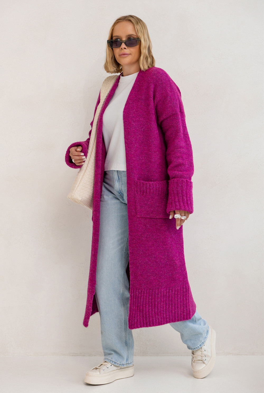 Długi kardigan o luźnym, oversizowym kroju to absolutny must have w kobiecej garderobie! Zwraca uwagę subtelnym splotem, praktycznymi kieszeniami i wywijanymi rękawami. To idealna propozycja do codziennych, komfortowych stylizacji, które łączą styl z wygodą.