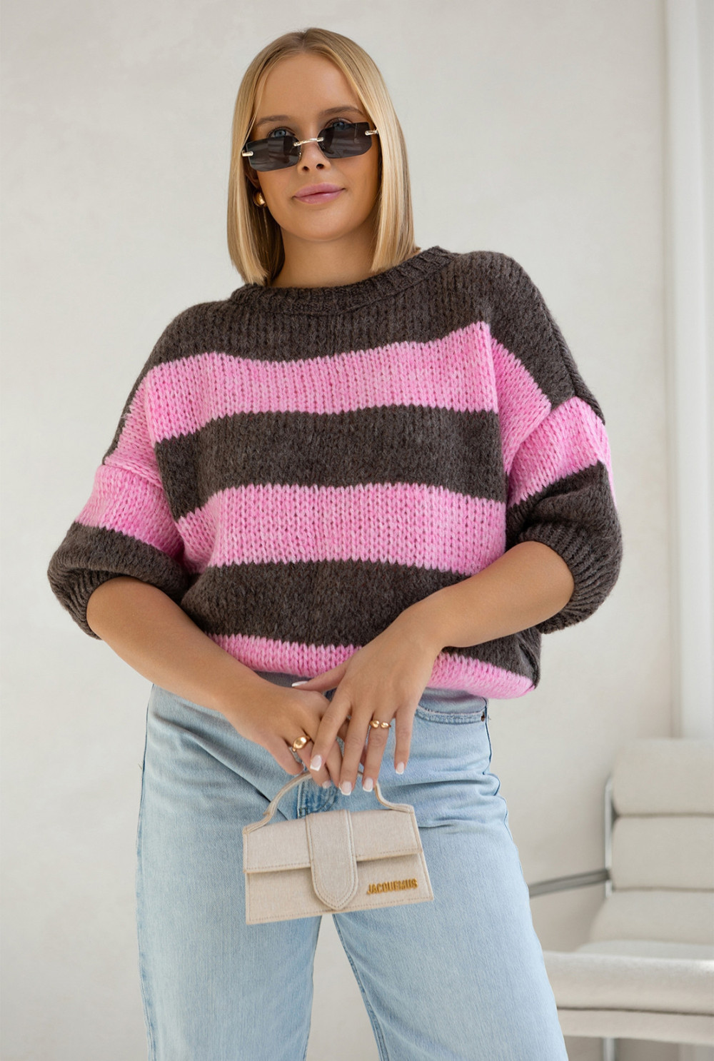 Krótki sweter w paski Gabriella Ciemne kakao-baby róż