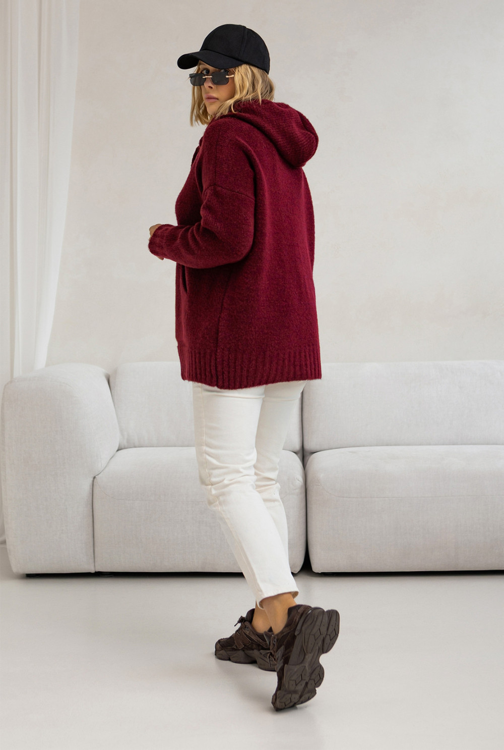 Sweter oversize z kapturem Kangurka Burgund