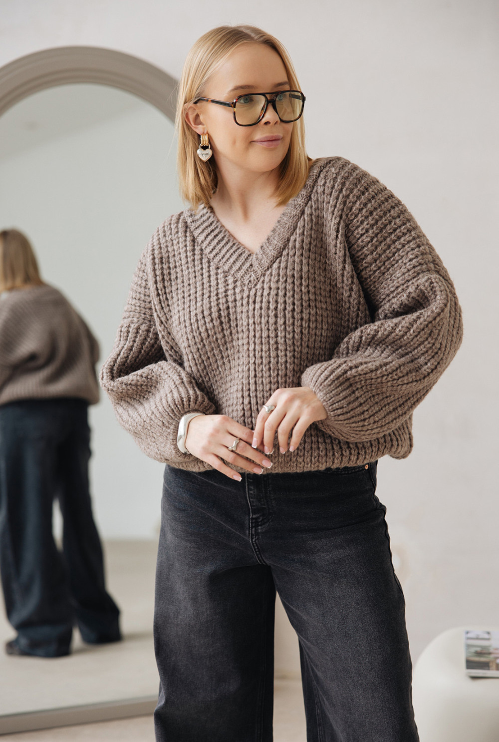 Sweter o luźnym, oversizowym kroju i efektownym splocie to must-have w garderobie każdej kobiety. Wykonany z miękkiego, elastycznego materiału, zapewnia wygodę i swobodę ruchów. Dekolt w serek oraz ściągacze u dołu i przy rękawach nadają mu kobiecego charakteru. Doskonały na co dzień - pasuje zarówno do jeansów, jak i spódnicy.