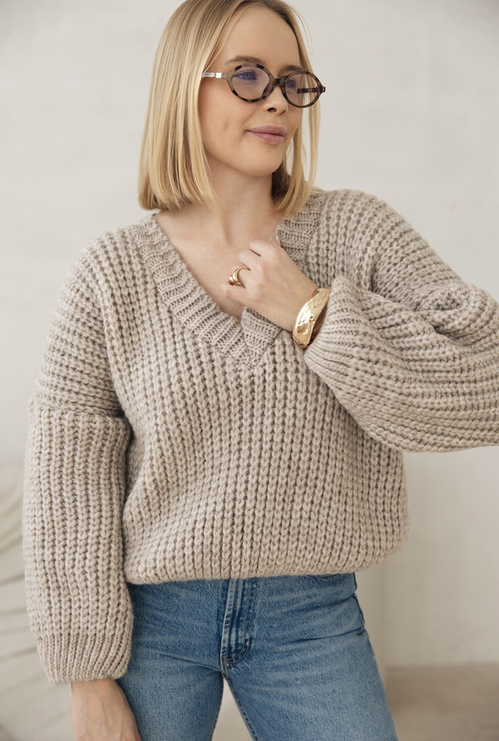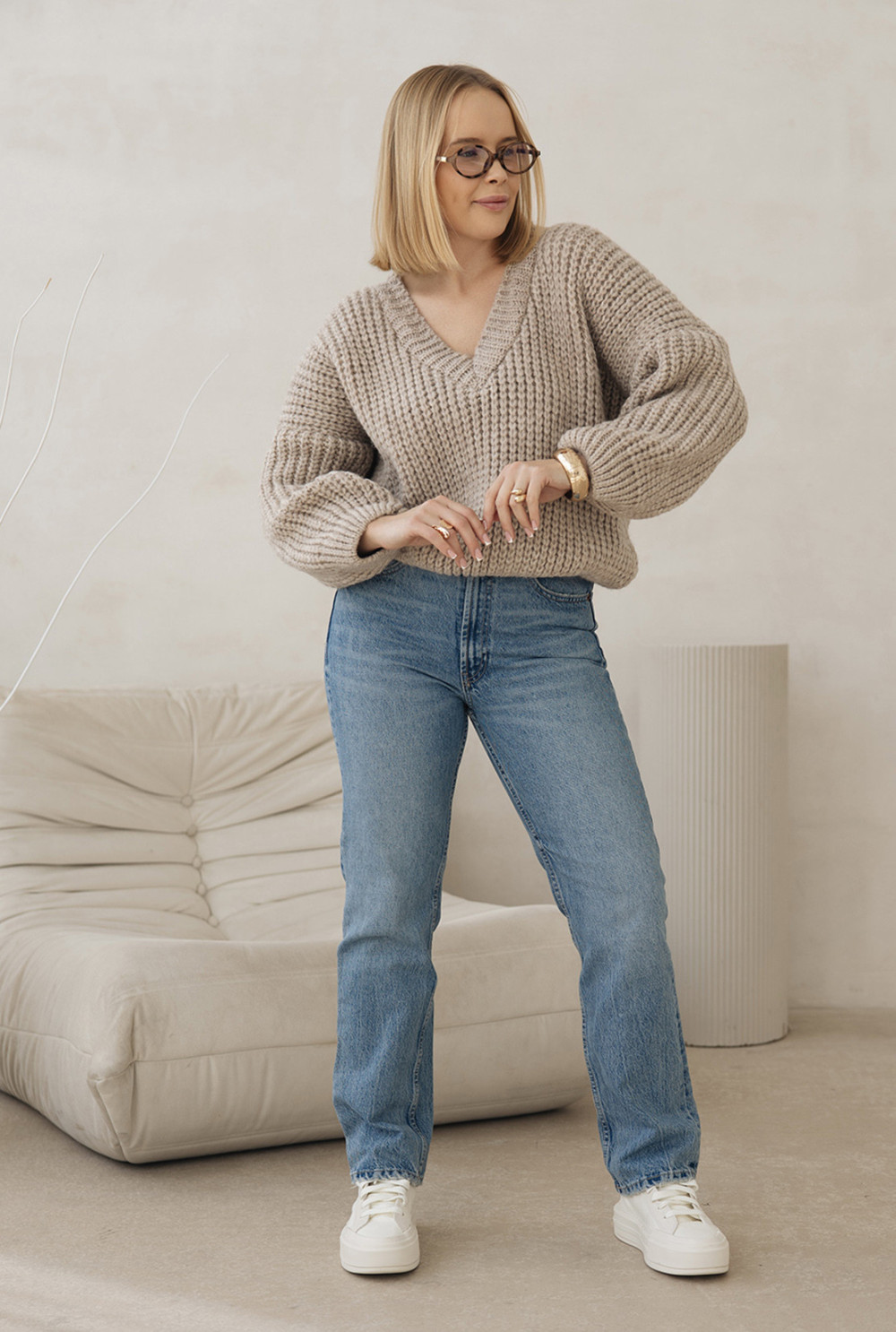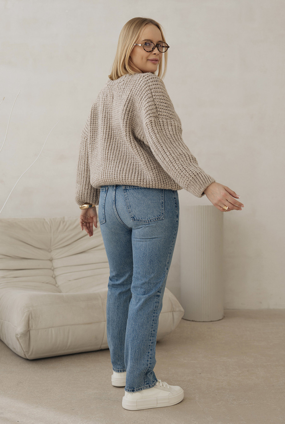 Sweter o luźnym, oversizowym kroju i efektownym splocie to must-have w garderobie każdej kobiety. Wykonany z miękkiego, elastycznego materiału, zapewnia wygodę i swobodę ruchów. Dekolt w serek oraz ściągacze u dołu i przy rękawach nadają mu kobiecego charakteru. Doskonały na co dzień - pasuje zarówno do jeansów, jak i spódnicy.
