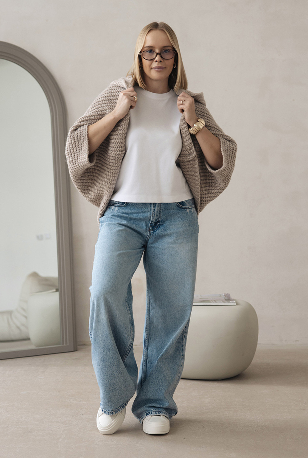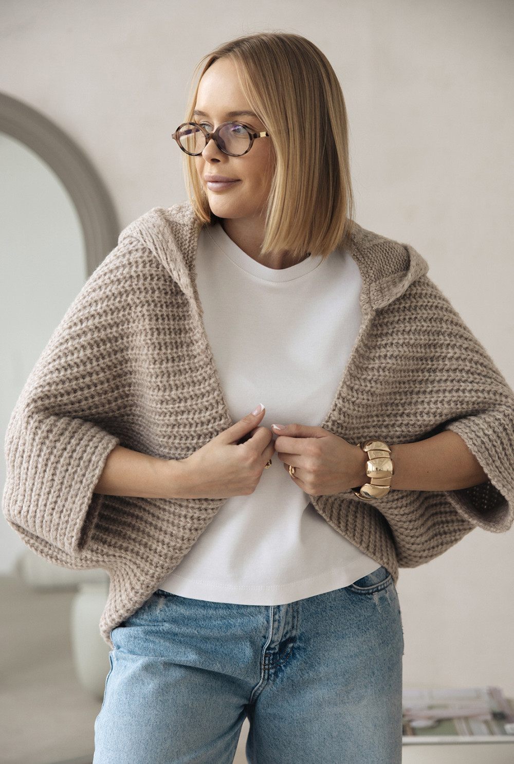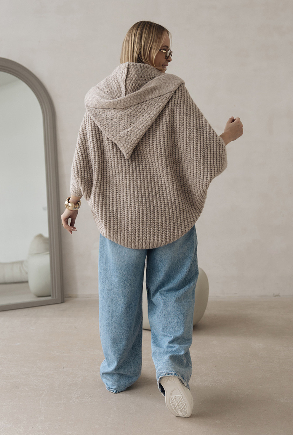 Oversizowy, niezapinany kardigan z kapturem wykonany z mięsistej dzianiny z dodatkiem wełny. Posiada obniżoną linię ramion, co nadaje mu luźny i swobodny fason. Idealny jako narzutka na chłodniejsze dni - miękki, przytulny i stylowy. Świetnie komponuje się z jeansami.