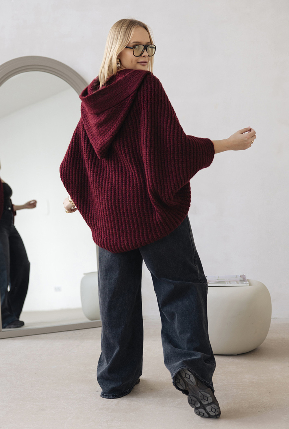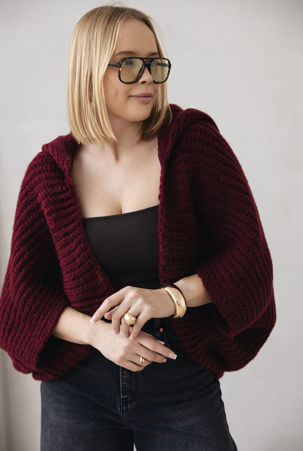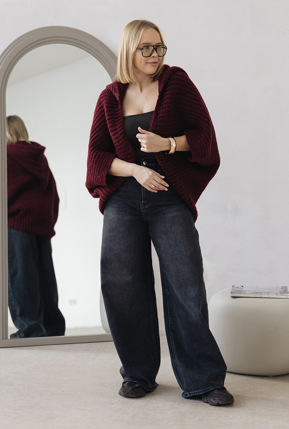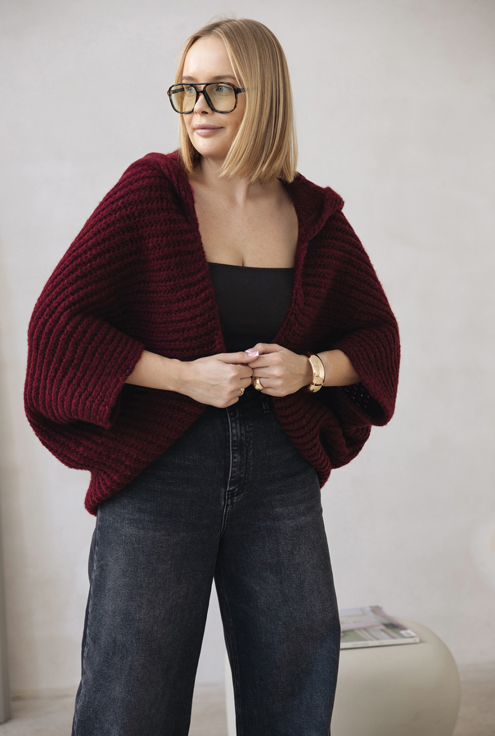 Oversizowy, niezapinany kardigan z kapturem wykonany z mięsistej dzianiny z dodatkiem wełny. Posiada obniżoną linię ramion, co nadaje mu luźny i swobodny fason. Idealny jako narzutka na chłodniejsze dni - miękki, przytulny i stylowy. Świetnie komponuje się z jeansami.