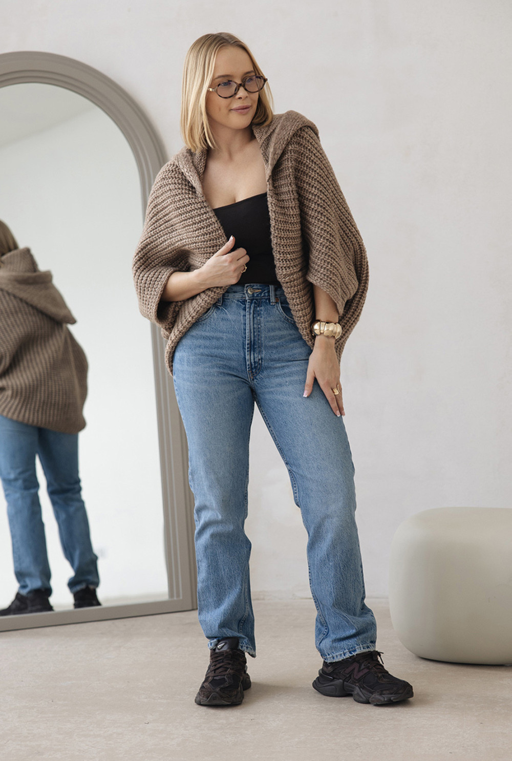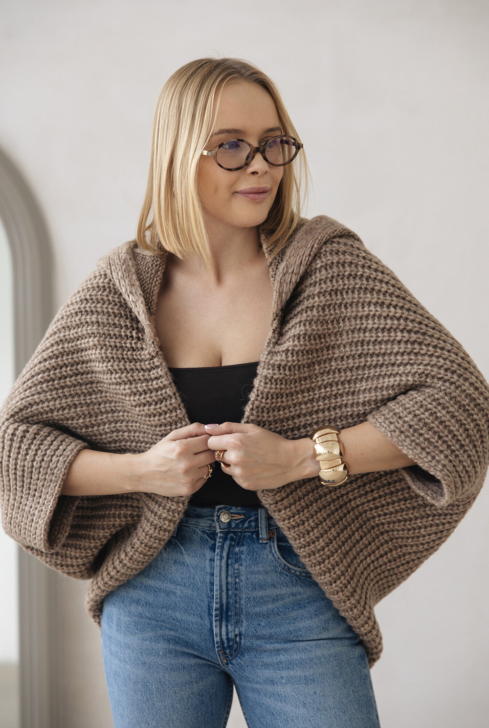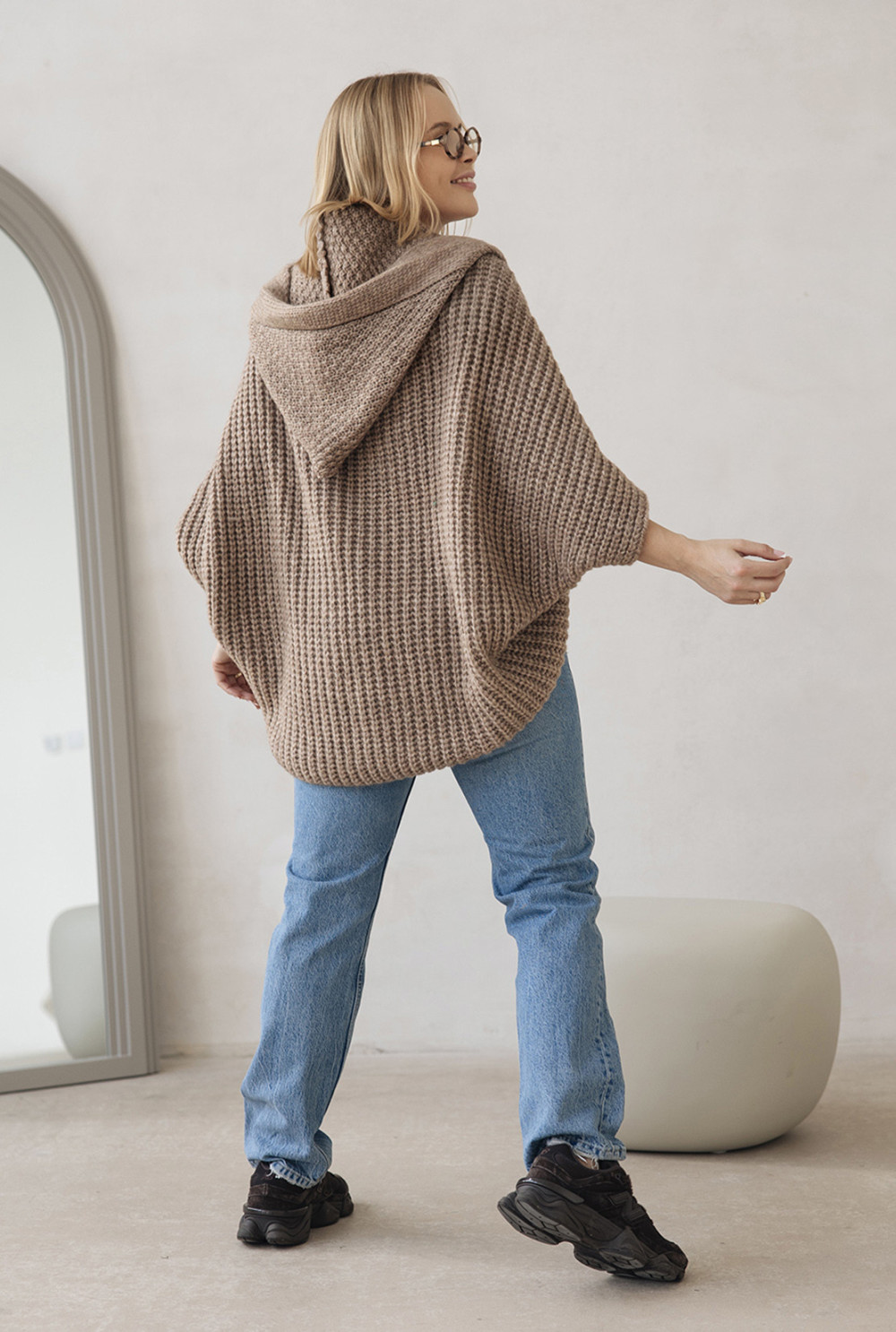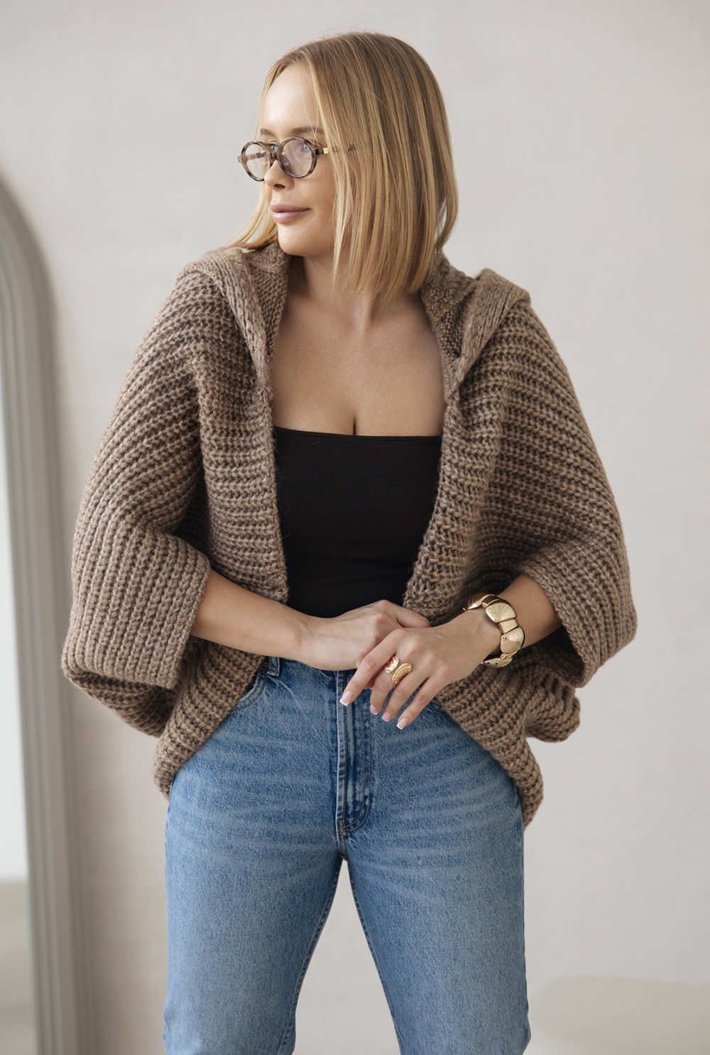 Oversizowy, niezapinany kardigan z kapturem wykonany z mięsistej dzianiny z dodatkiem wełny. Posiada obniżoną linię ramion, co nadaje mu luźny i swobodny fason. Idealny jako narzutka na chłodniejsze dni - miękki, przytulny i stylowy. Świetnie komponuje się z jeansami.