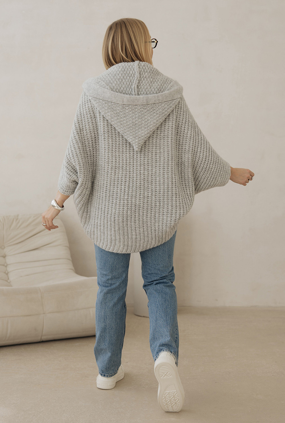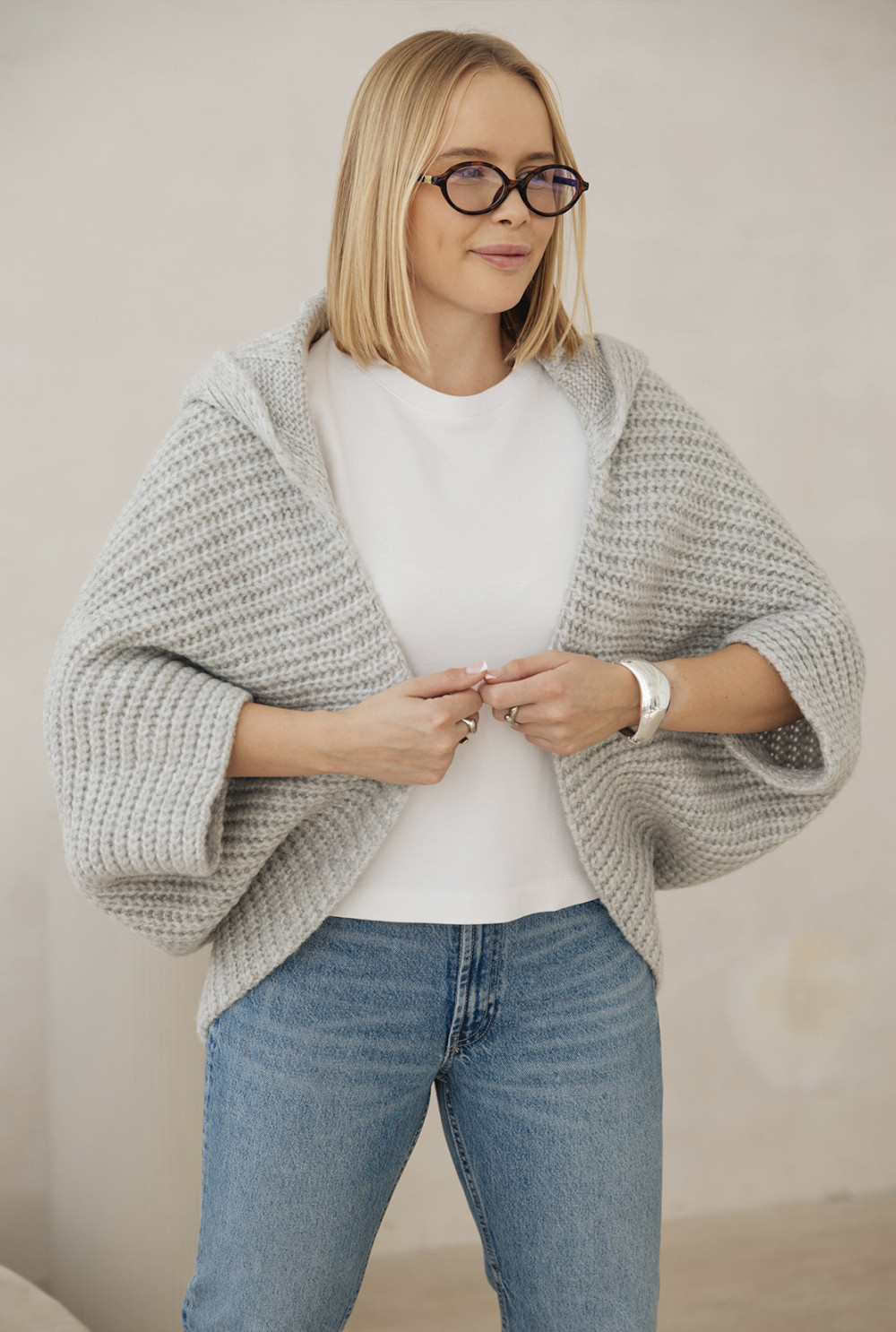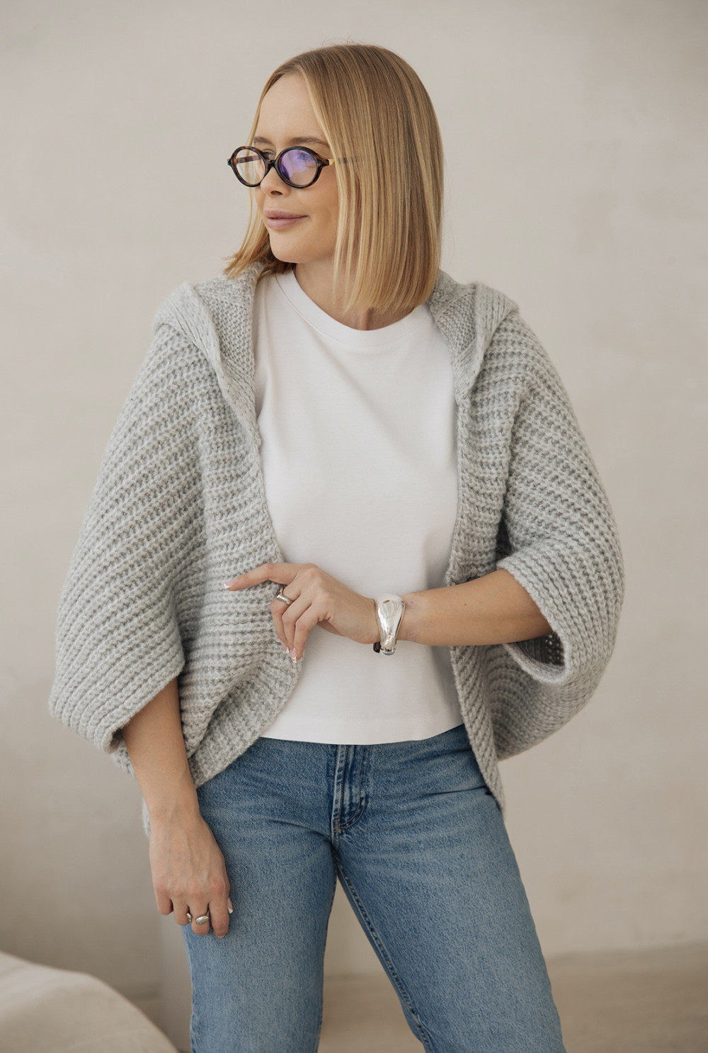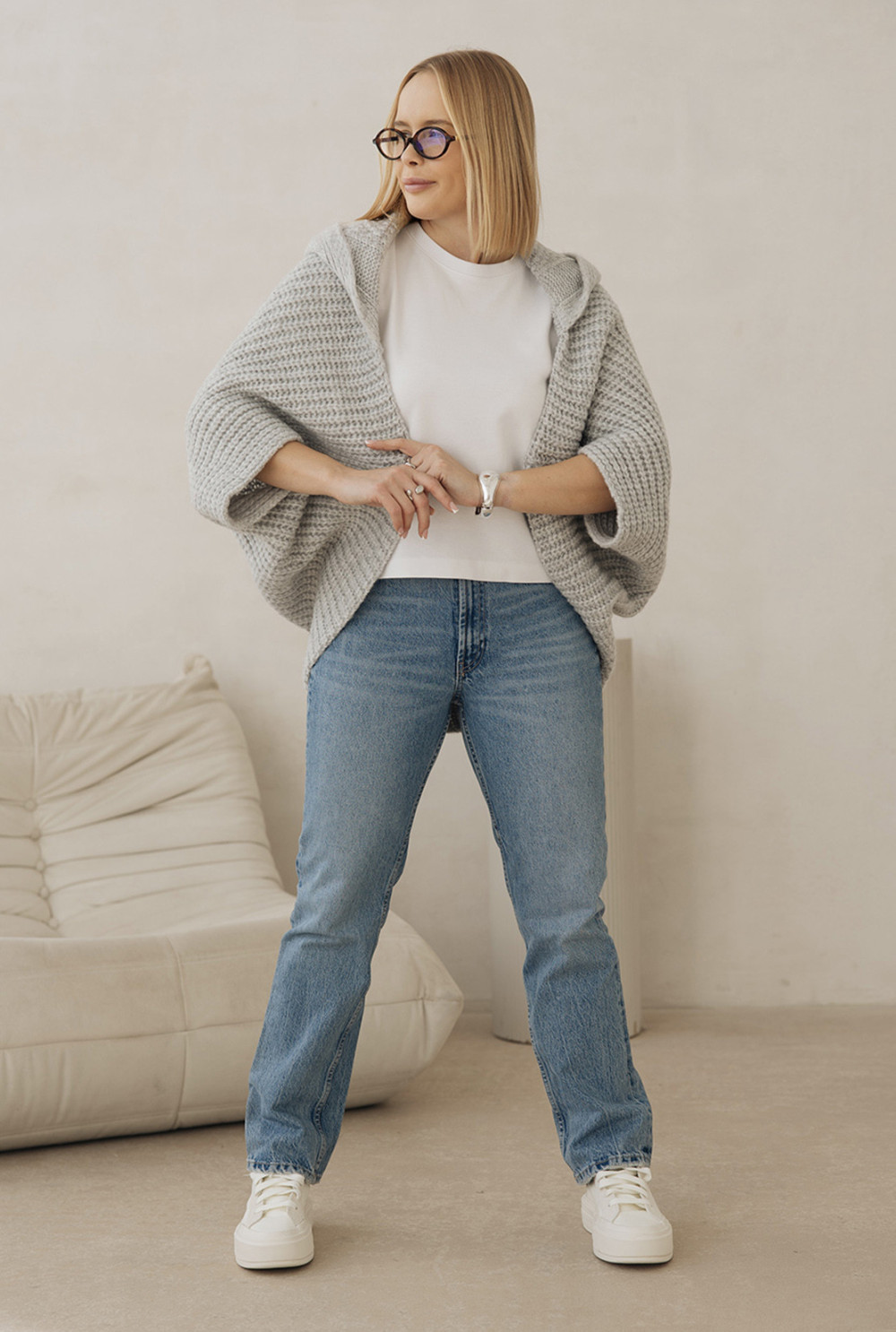 Oversizowy, niezapinany kardigan z kapturem wykonany z mięsistej dzianiny z dodatkiem wełny. Posiada obniżoną linię ramion, co nadaje mu luźny i swobodny fason. Idealny jako narzutka na chłodniejsze dni - miękki, przytulny i stylowy. Świetnie komponuje się z jeansami.