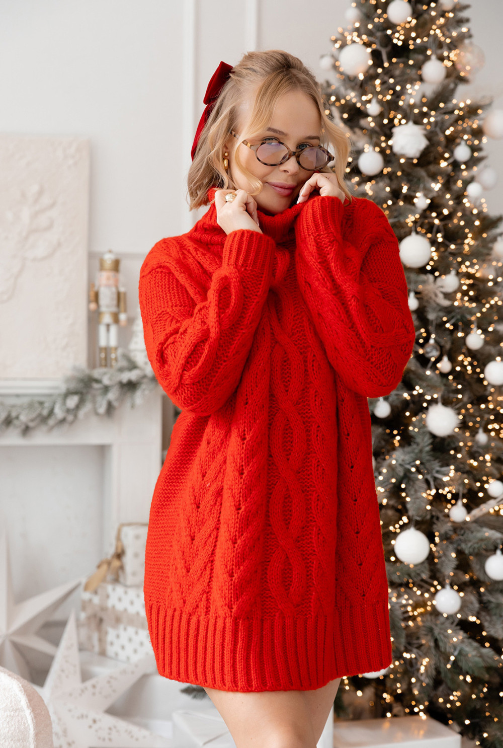 Dłuższy sweter z golfem i ozdobnym splotem. Model zakończony ściągaczem przy rękawach i na dole. Możesz zestawić go z halką lub spodniami i ciężkimi butami – świetna stylizacja gotowa!