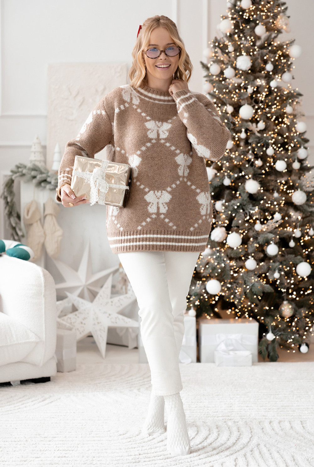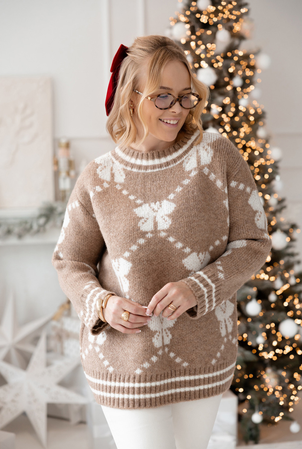 Świąteczny sweter w kokardy to idealny wybór na zimowy sezon! Miękki, ciepły i przyjemny w dotyku, z dodatkiem wełny. Luźniejszy krój zapewnia komfort noszenia, a wzór w kokardy dodaje uroku i świątecznego nastroju. Dostępny w kilku kolorach.