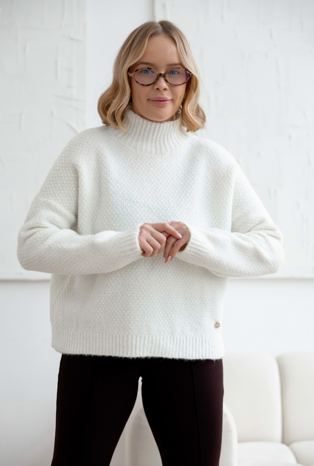 Miękki, ciepły sweter z golfem, idealny na chłodniejsze dni. Wykonany z dbałością o detale z wełna w składzie. Klasyczny, lekko oversizeowy krój dodaje mu nowoczesnego, a jednocześnie ponadczasowego charakteru. Dostępny w kilku wariantach kolorystycznych.