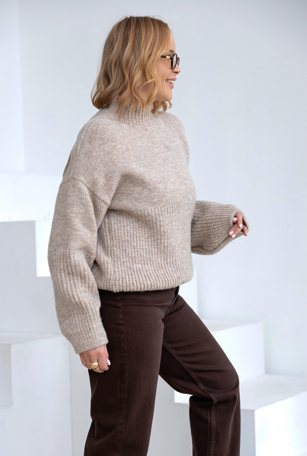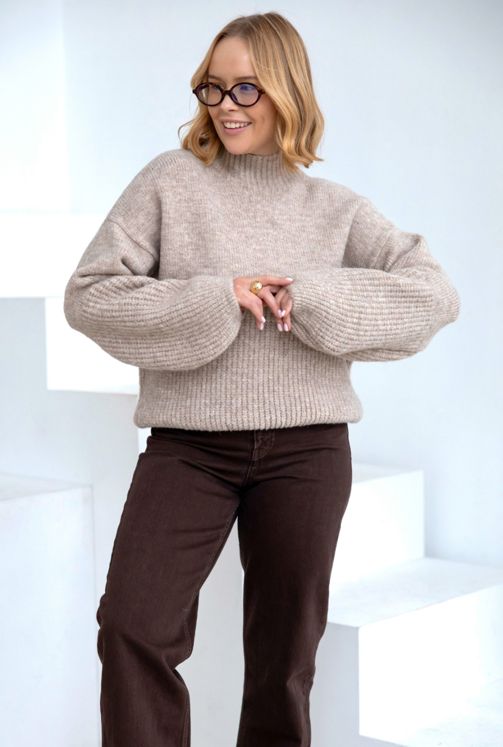 Miękki, przyjemny w dotyku sweterek z dodatkiem wełny. Model o lekko skróconym kroju i delikatnie zaokrąglonym dekolcie pięknie układa się na sylwetce. Charakteru dodają mu szersze rękawy zakończone ściągaczami, takimi samymi jak dół swetra.