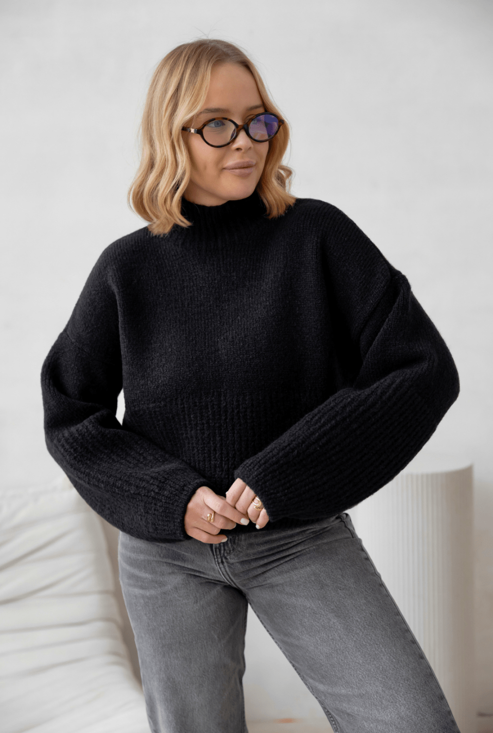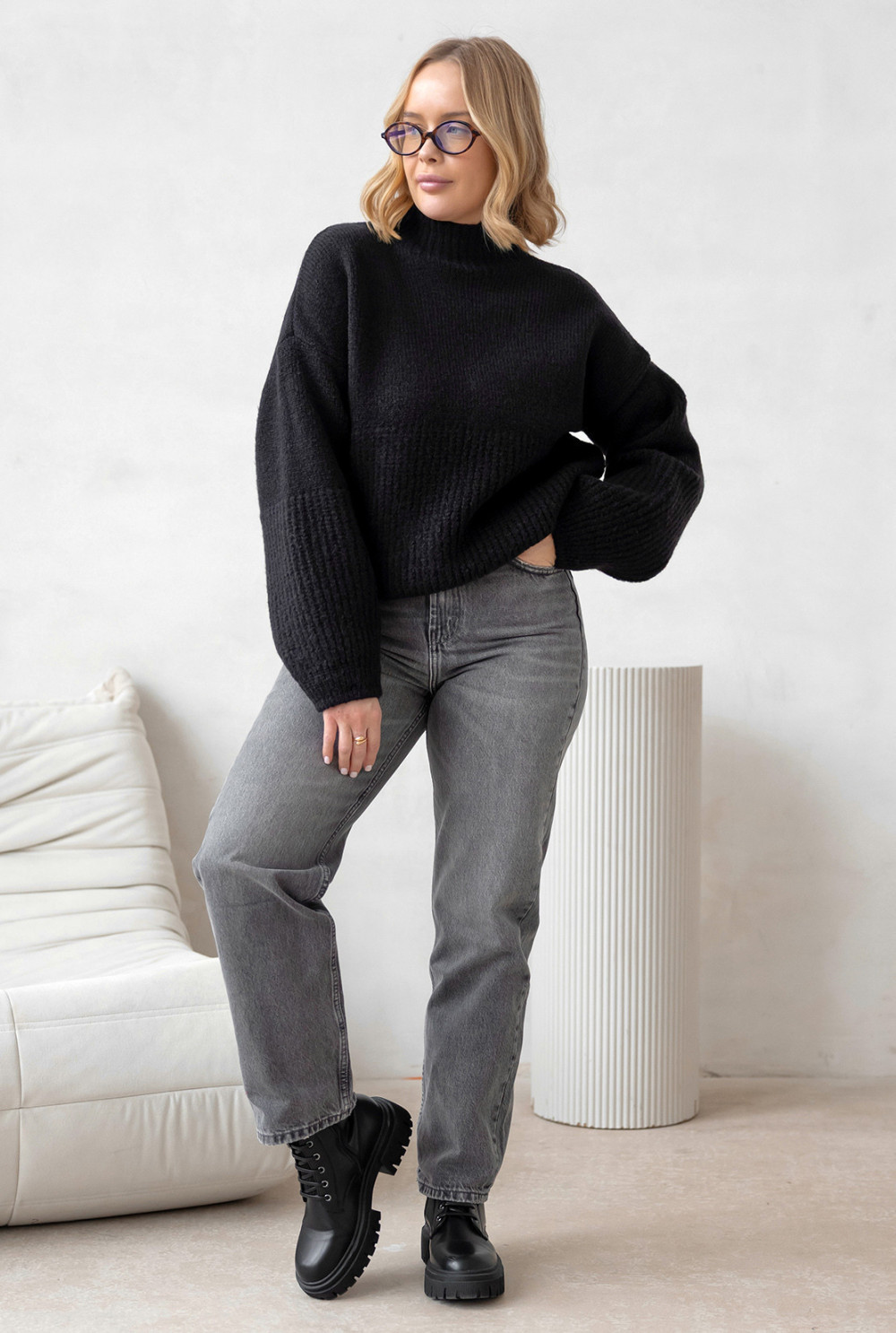 Miękki, przyjemny w dotyku sweterek z dodatkiem wełny. Model o lekko skróconym kroju i delikatnie zaokrąglonym dekolcie pięknie układa się na sylwetce. Charakteru dodają mu szersze rękawy zakończone ściągaczami, takimi samymi jak dół swetra.