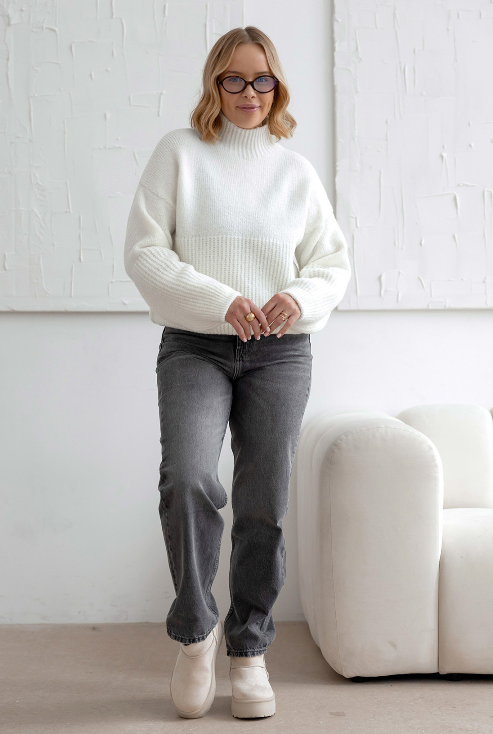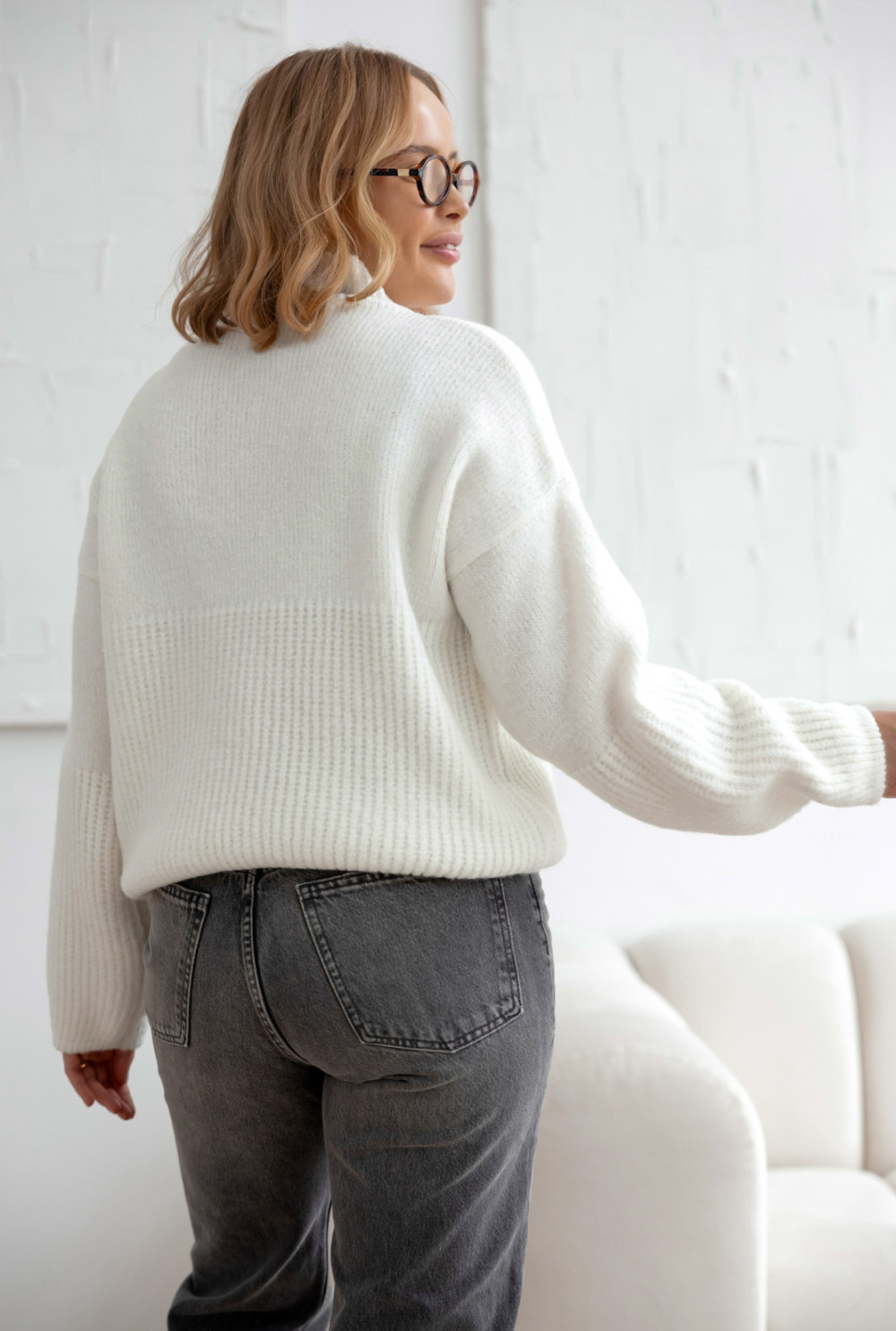Miękki, przyjemny w dotyku sweterek z dodatkiem wełny. Model o lekko skróconym kroju i delikatnie zaokrąglonym dekolcie pięknie układa się na sylwetce. Charakteru dodają mu szersze rękawy zakończone ściągaczami, takimi samymi jak dół swetra.