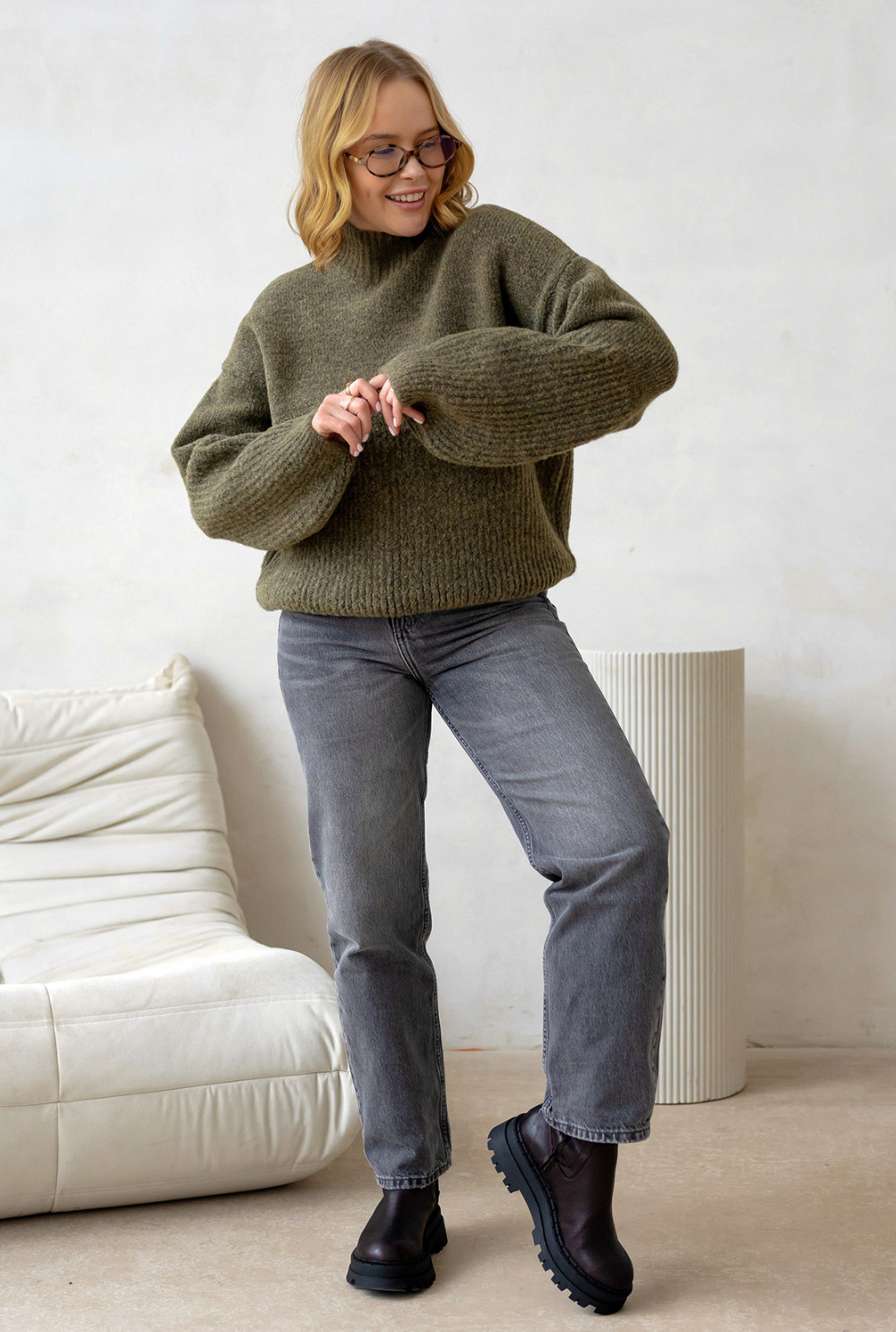 Miękki, przyjemny w dotyku sweterek z dodatkiem wełny. Model o lekko skróconym kroju i delikatnie zaokrąglonym dekolcie pięknie układa się na sylwetce. Charakteru dodają mu szersze rękawy zakończone ściągaczami, takimi samymi jak dół swetra.