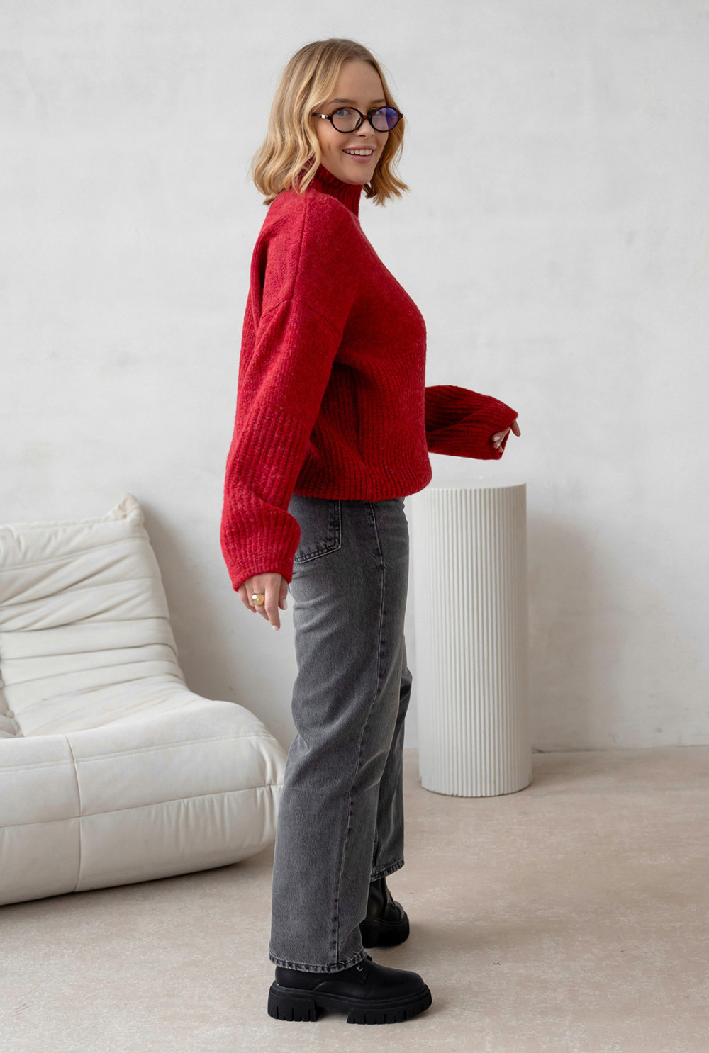 Miękki, przyjemny w dotyku sweterek z dodatkiem wełny. Model o lekko skróconym kroju i delikatnie zaokrąglonym dekolcie pięknie układa się na sylwetce. Charakteru dodają mu szersze rękawy zakończone ściągaczami, takimi samymi jak dół swetra.