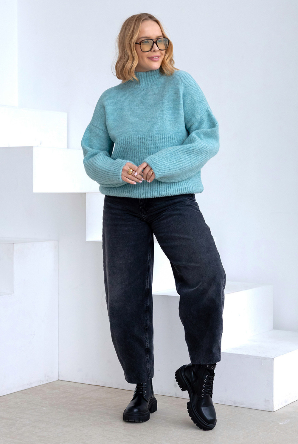 Miękki, przyjemny w dotyku sweterek z dodatkiem wełny. Model o lekko skróconym kroju i delikatnie zaokrąglonym dekolcie pięknie układa się na sylwetce. Charakteru dodają mu szersze rękawy zakończone ściągaczami, takimi samymi jak dół swetra.