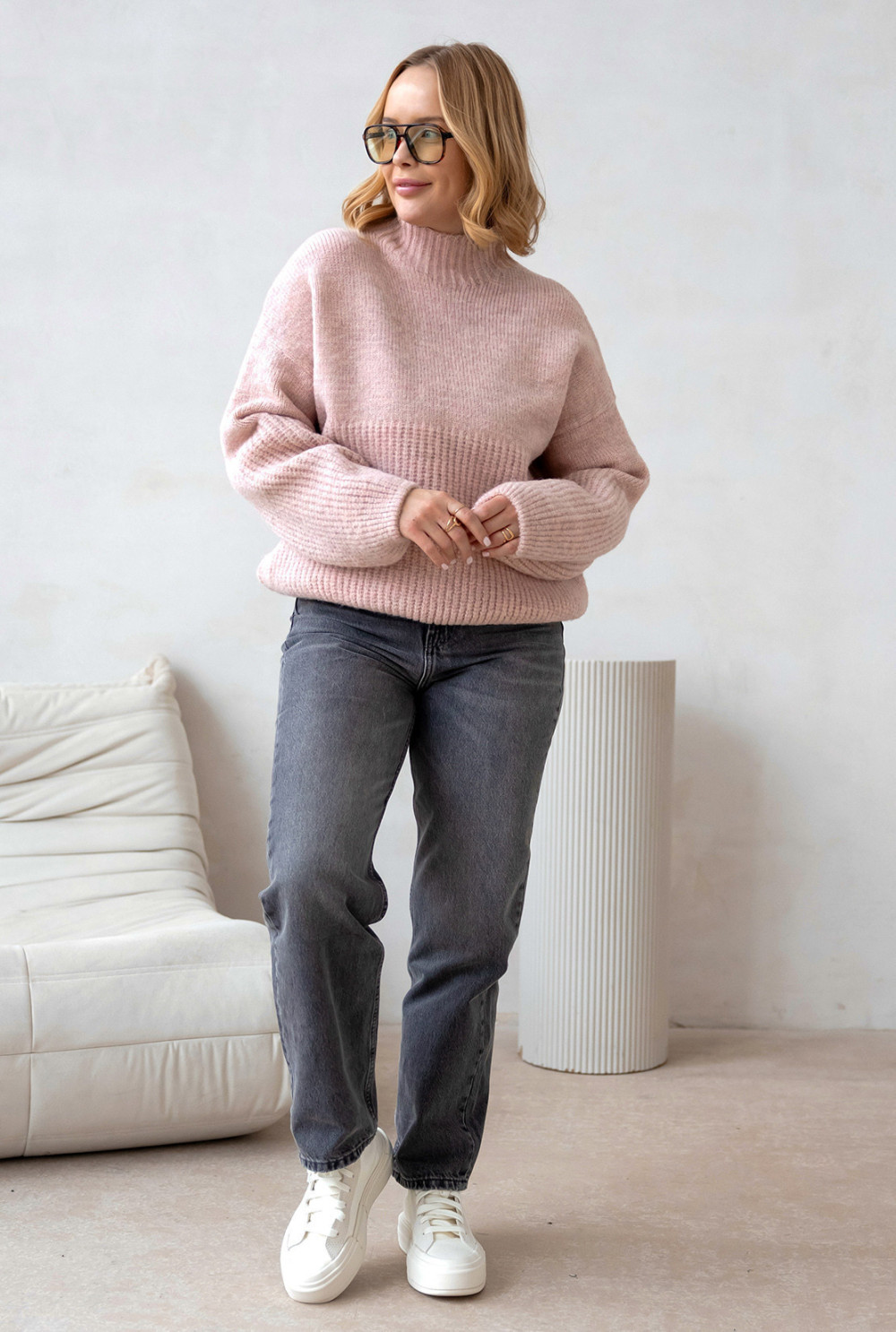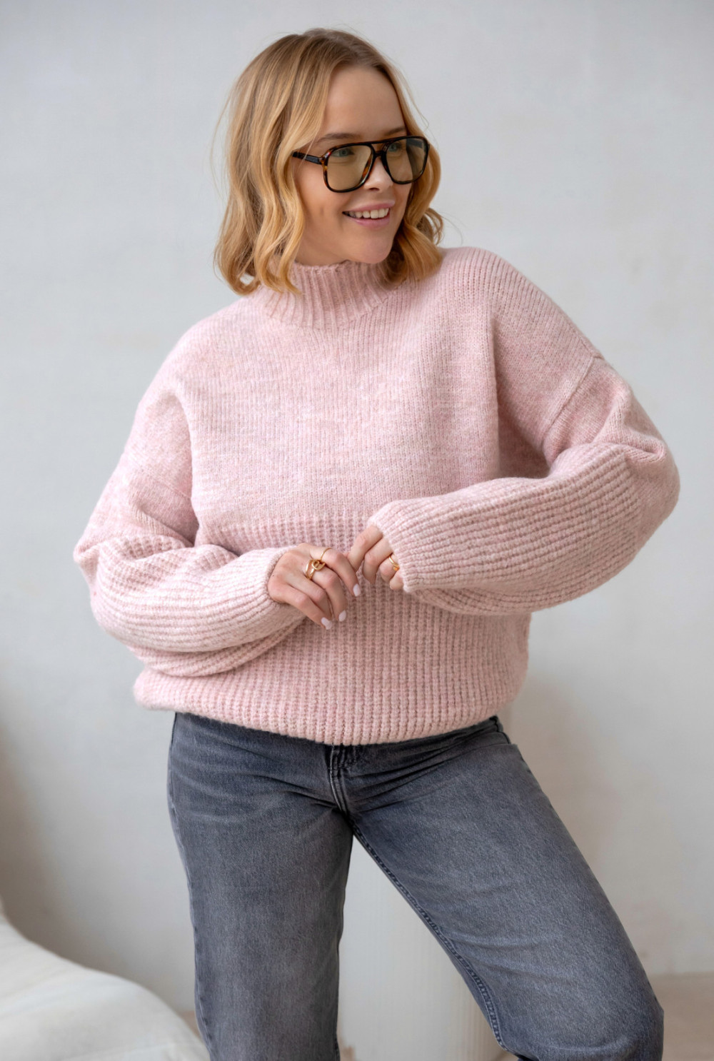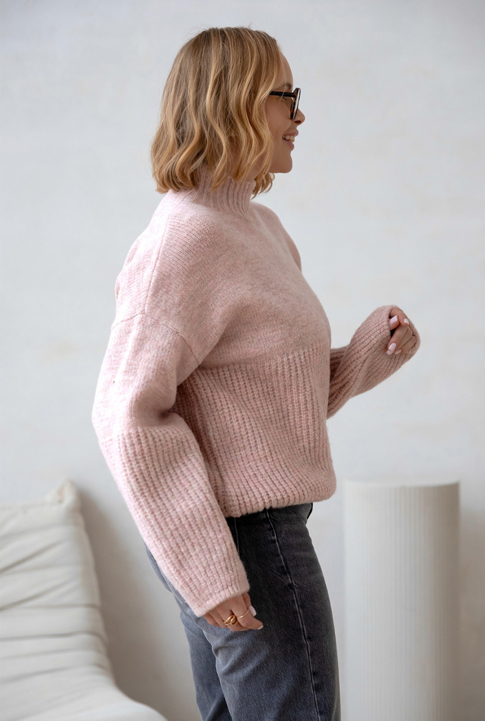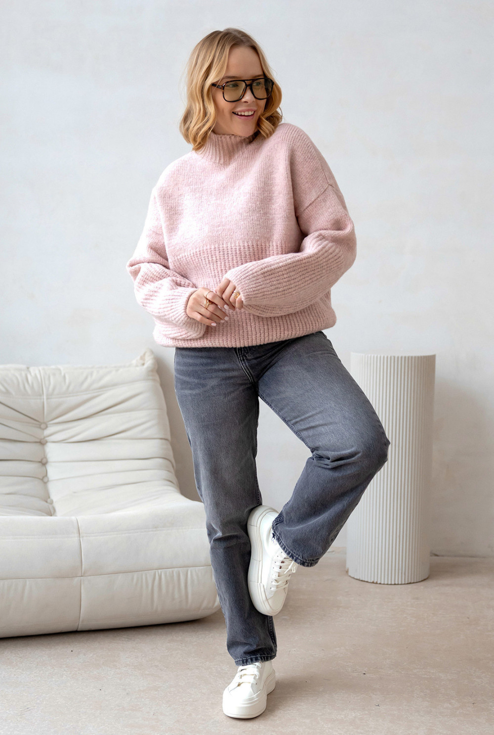 Miękki, przyjemny w dotyku sweterek z dodatkiem wełny. Model o lekko skróconym kroju i delikatnie zaokrąglonym dekolcie pięknie układa się na sylwetce. Charakteru dodają mu szersze rękawy zakończone ściągaczami, takimi samymi jak dół swetra.