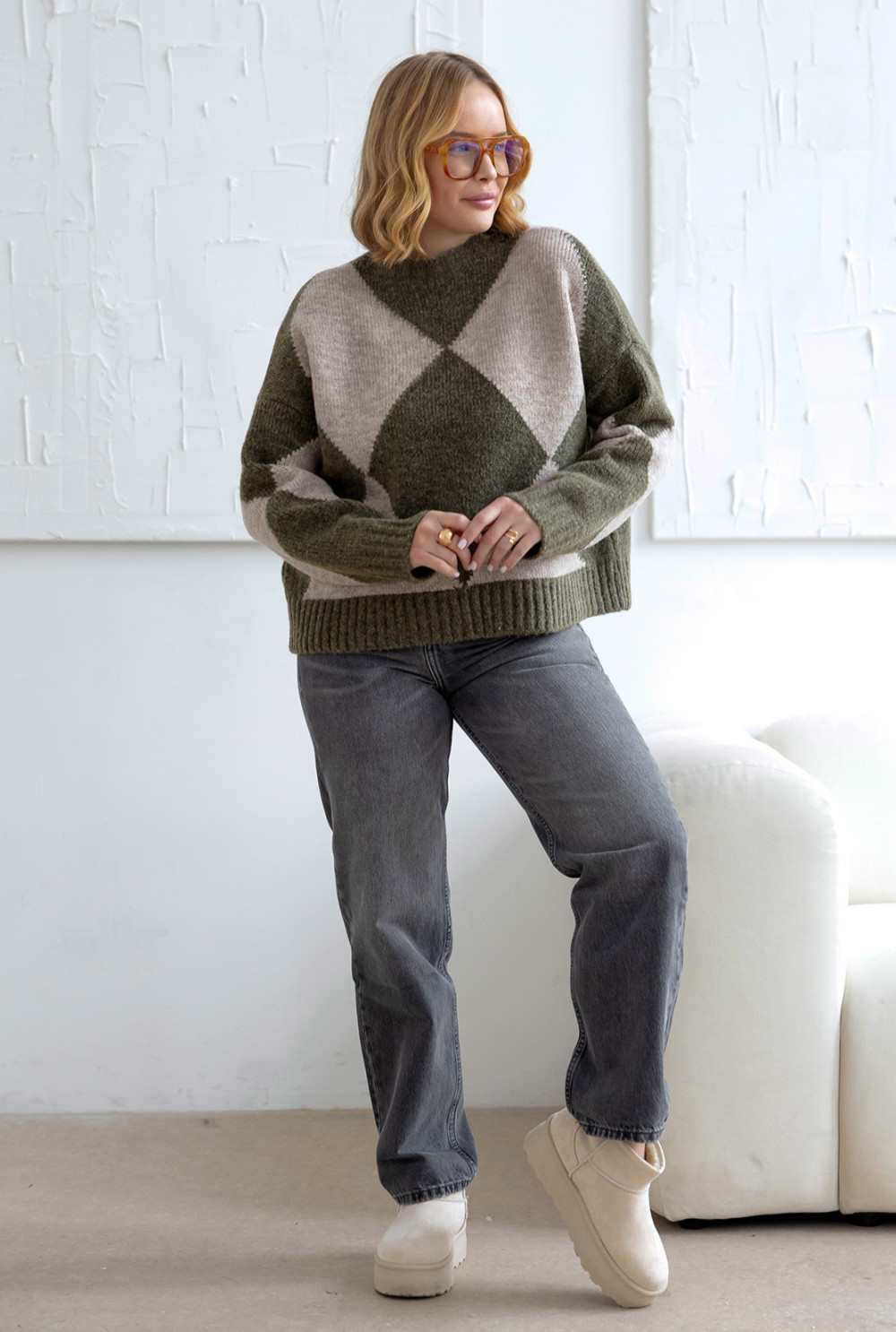 Miękki sweter w romby świetnie zaprezentuje się w codziennych stylizacjach w jesienno-zimowym sezonie. Wyróżnia się niebanalnym połączeniem kolorystycznym, nadającym całości niepowtarzalnego charakteru. To model o klasycznym fasonie z długimi rękawami.