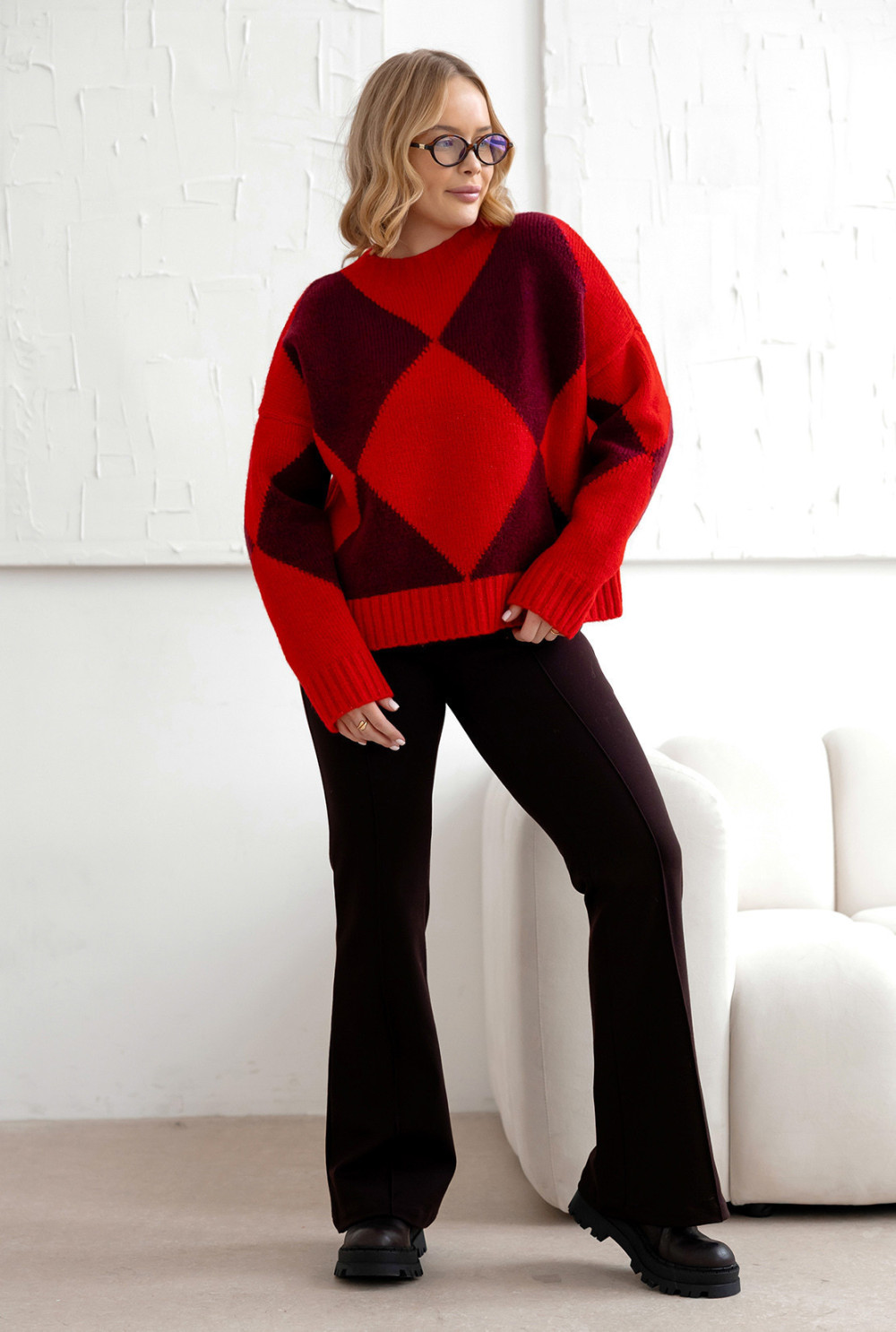Miękki sweter w romby świetnie zaprezentuje się w codziennych stylizacjach w jesienno-zimowym sezonie. Wyróżnia się niebanalnym połączeniem kolorystycznym, nadającym całości niepowtarzalnego charakteru. To model o klasycznym fasonie z długimi rękawami.