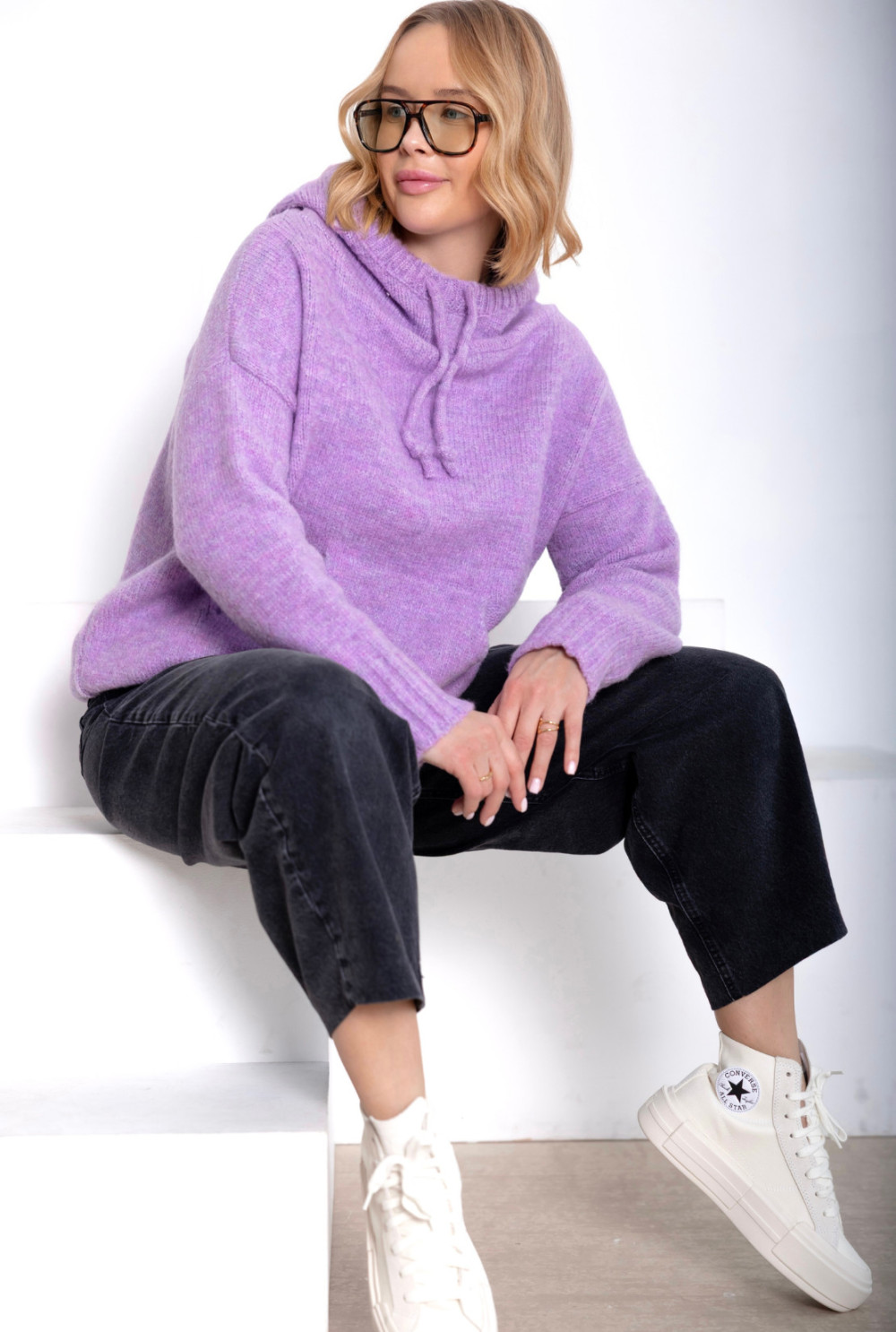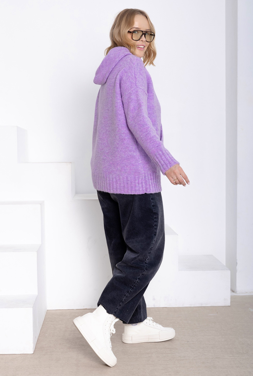 Luźny sweter z miękkiej, przyjemnej w dotyku dzianiny. Posiada kaptur ze ściągaczem, obszerną kieszeń z przodu oraz rękawy zakończone ściągaczami. Dostępny w kilku wariantach kolorystycznych.