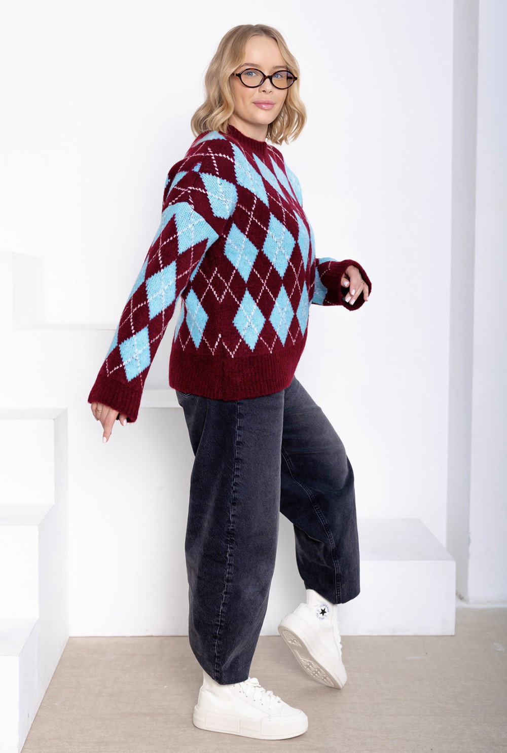 Sweter w romby Candy Burgund-niebo